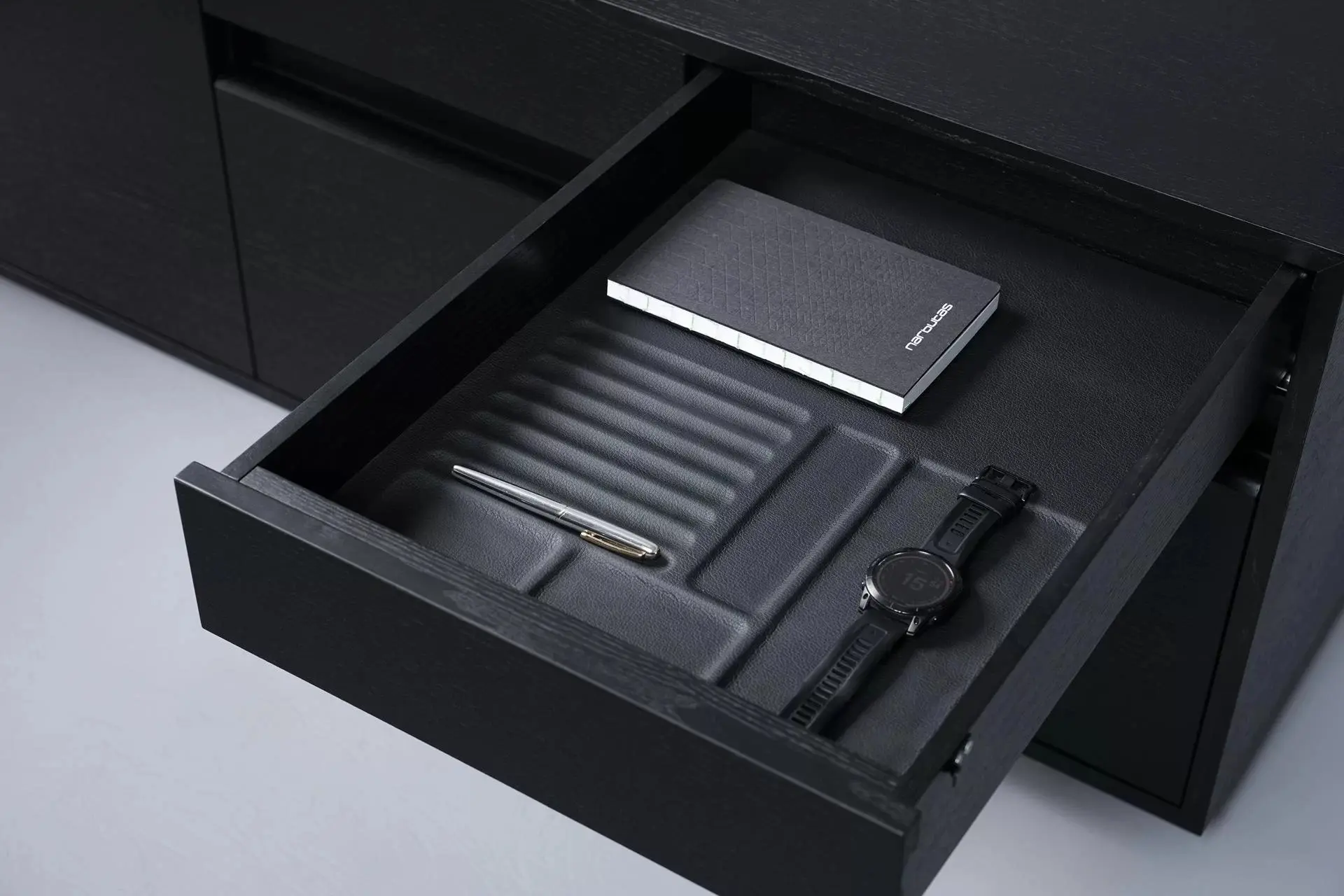 - 18 mm MDF covered in veneer with four drawers and two closed storage spaces.