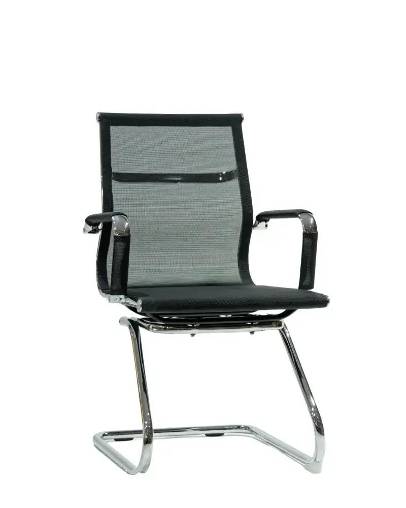 Scaun de birou modern, realizat într-un stil minimalist, ideal pentru cabinet, sală de ședințe sau biroul de acasă. Modelul este prevăzut cu spătar ergonomic cu inserție din plasă, care asigură o bună ventilație și confort chiar și în timpul utilizării îndelungate. Cadrul metalic rezistent, cu bază tip sanie, oferă stabilitate și durabilitate. Cotierele asigură susținere suplimentară pentru brațe, reducând tensiunea din zona umerilor și a spatelui. Alegerea perfectă pentru cei care apreciază confortul, funcționalitatea și designul modern.