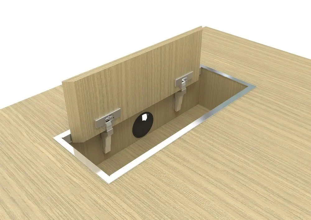 - Orificiu rotund pentru cablu din plastic negru în centrul laturii lungi, Ø60 mm.