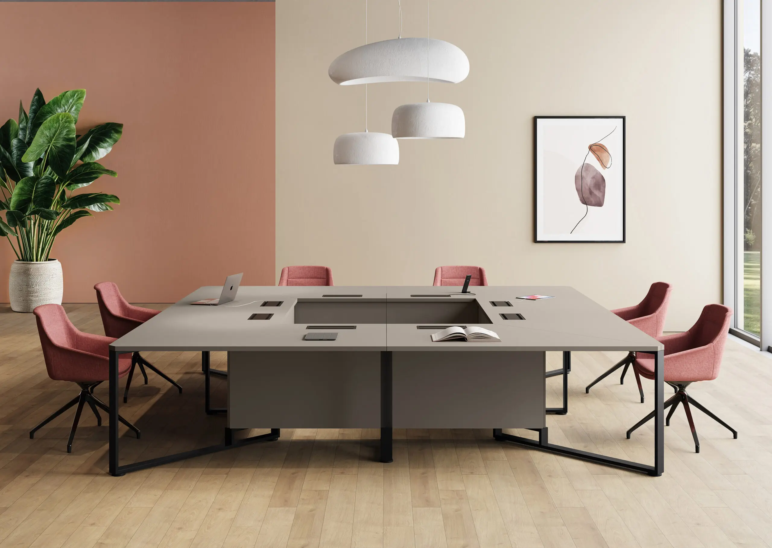 I-Meet meeting tables are designed for modern meeting rooms that host teleconferencing and often use audio and video equipment. I-Meet offers a wide range of shape and size modeling capabilities. By combining different I-Meet table modules, you can create the ideal space for small meeting rooms and large conference rooms.