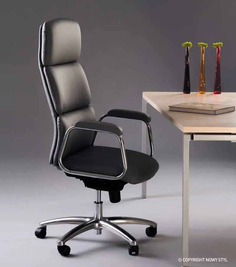 An elegant and modern model with a tall back and a comfortable head cushion. This model is fitted with T-shaped arm pads with leather pads, which are adjustable in height. Polished aluminum base. Synchronized swing mechanism with five positions fixation.