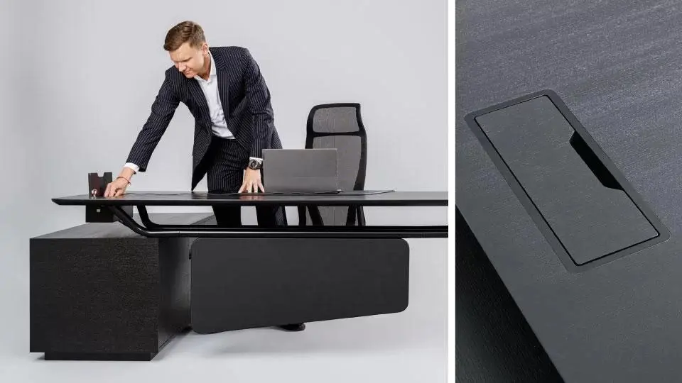 - Ramă metalică din oțel – 13 mm lățime în partea de sus, la același nivel cu suprafața biroului; metal vopsit în câmp electrostatic;