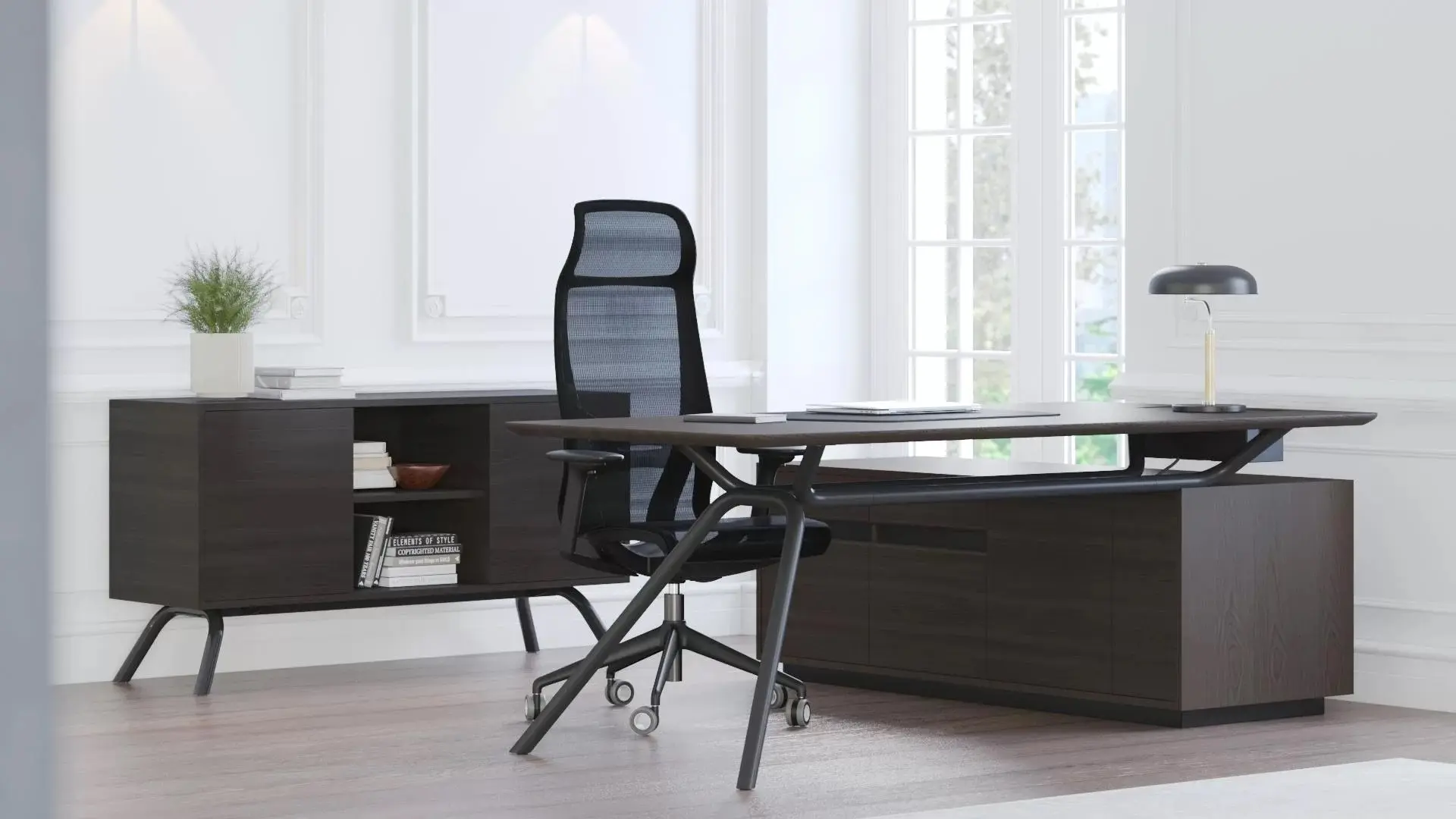 - Ramă metalică din oțel – 13 mm lățime în partea de sus, la același nivel cu suprafața biroului; metal vopsit în câmp electrostatic;