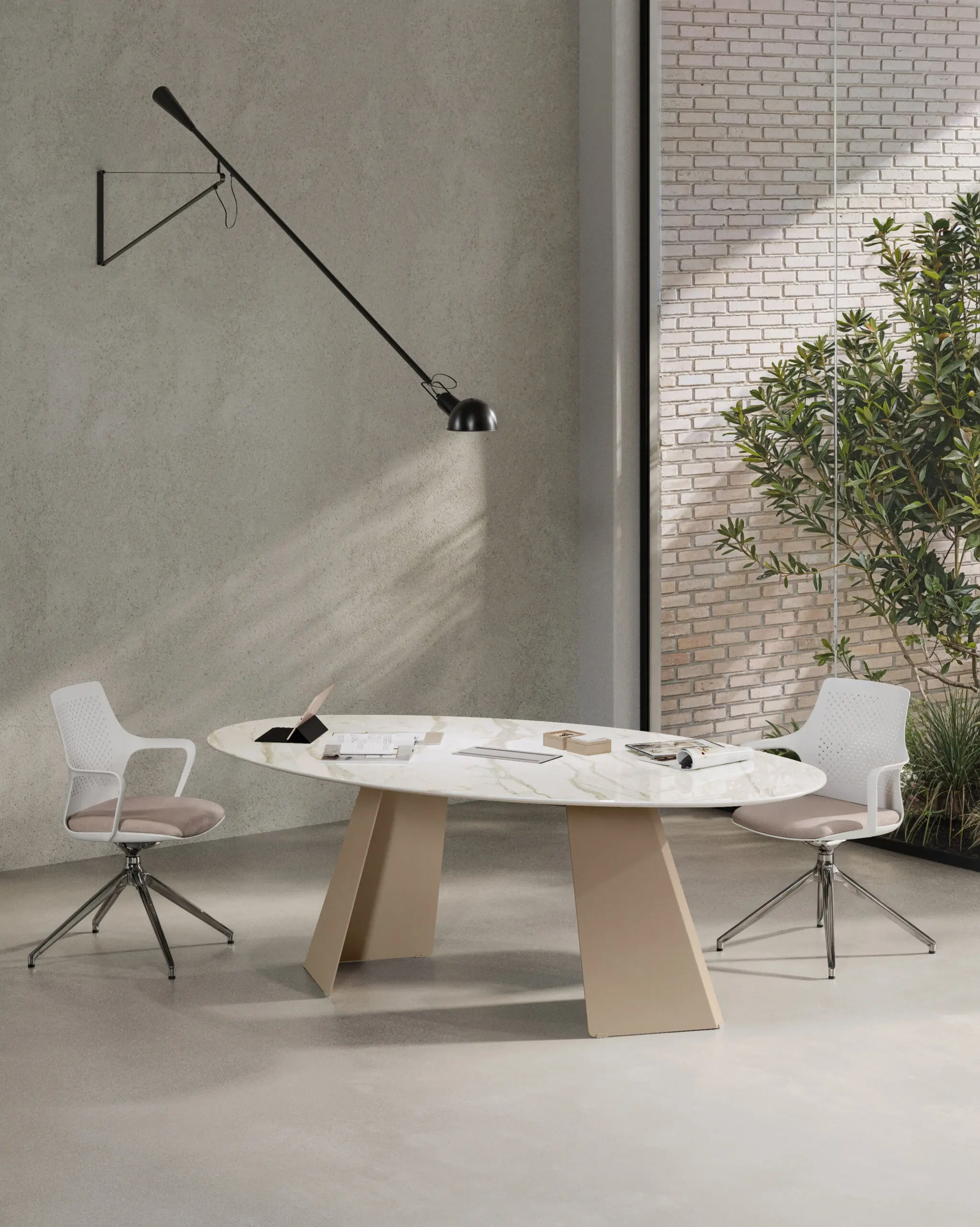 Monolith, un sistem executiv care combină eleganța și caracterul cu stilul. Designul bazei metalice, un element distinctiv și sculptural, conferă o notă modernă și rafinată spațiilor. Ideal pentru a face fiecare mediu unic și elegant.